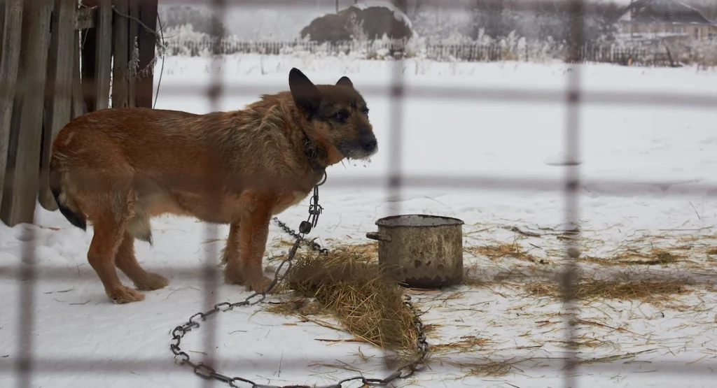 Animals left tethered outdoors are at heightened risk. Cold winds, ice buildup, and frozen ground can immobilize tethered dogs and prevent them from seeking shelter. Owners who tie dogs outside must reconsider this practice during extreme weather, provide insulated and elevated shelter off frozen ground, and ensure the animal’s ability to exit and re-enter as weather fluctuates.