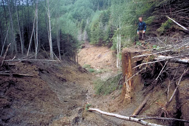 On January 1, 1997, failures of an old logging road across McArthur Creek caused more than 10,000 truckloads of dirt to rapidly erode downstream. (Photo: National Park Service)