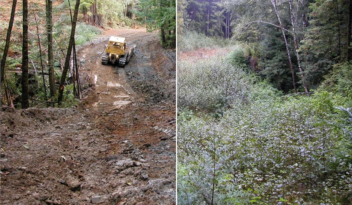 Photo caption: Left side of image: Heavy equipment is used to reoccupy logging roads. Right side: Ten feet of dirt was removed to get to the old hillslope, and logs are placed where the road was. (Photo: National Park Service/Neal Youngblood)